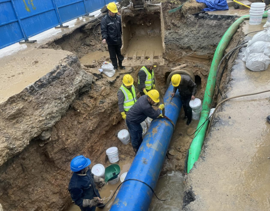 險情就是命令,凌晨1點,公司立即組織10余名搶修人員到場關(guān)閘止水。與此同時,技術(shù)人員、施工人員和設(shè)備設(shè)施“跑步前進”、同步到場,對破損溢水點進行邊開挖、邊診斷。為加快搶修速度,減少對周邊用戶的影響,30余名搶修人員頂著嚴寒天氣連夜搶修。